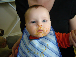 With 6 months of age, comes FOOD!! Yes, its time to unleash the taste buds and explore the fanciful world of food. He's been hanging in there with the rice cereal, and so we've introduced every child's favorite...SWEET POTATO! No big face of enthusiasm, or rejection, so it went pretty well. Its hard to tell how much got to his belly...the hands were in the way a lot, and orange is such a fun color to smear everywhere. Say goodbye to the crisp clean clothes...and bring on the ZOUT.
